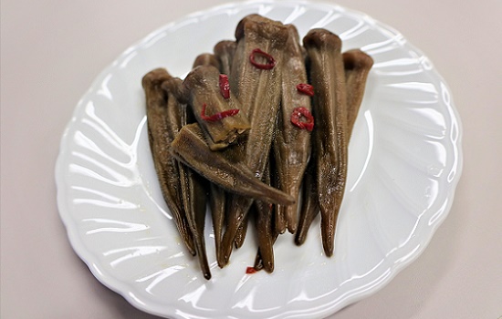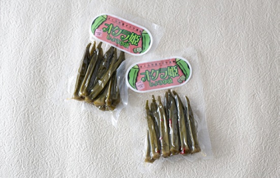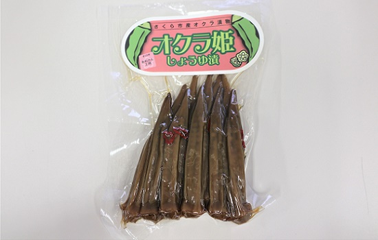地元農家の女性が中心になって地産の農産物を使ったさまざまな手作り加工品の製造を行なう「あねさん工房」。「オクラのしょうゆ漬 オクラ姫」は、栃木県唯一の共同出荷に取り組んでいる氏家地区で栽培されたオクラの漬物。夏に収穫し、それを塩漬けにして一時保管した後、塩抜きしてしょう油、ショウガ、ニンニク、唐辛子で作った調味液に漬け込んだユニークなしょうゆ漬けです。生と違って粘りがなく、パリパリとした歯ごたえの良さが特徴。そのままでも良し、刻んでご飯の中に混ぜても美味しくいただけます。
