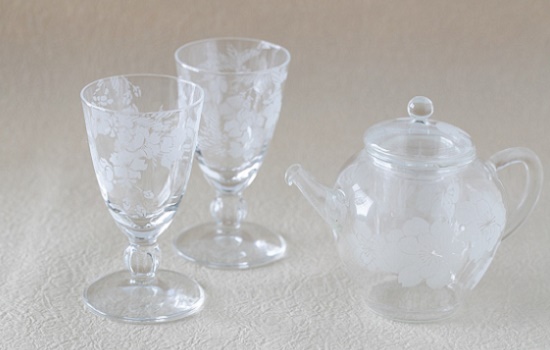 ガラスの表面に刻まれた桜の模様。一点ずつ施される丁寧なハンドワークによって、グラスやポットに彫られた清楚な美しさが印象的です。氏家駅前にアトリエを構える「アッセンブル」はサンドブラストとグラスリッツェンという手法で彫刻を施すガラスアート工房。桜をはじめ、季節の花々や物語のワンシーンなどさまざまなモチーフをガラスに刻みつけたオリジナルのアートガラスを制作しています。「さくらグラス」は、さくら市の名にちなんで作られたガラスシリーズ。さまざまな表情の桜の花がガラスを彩ります。