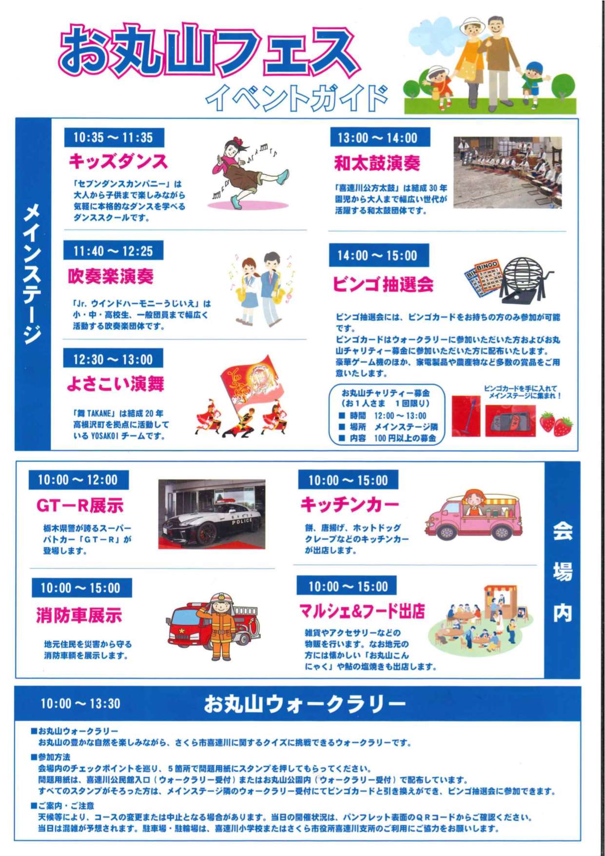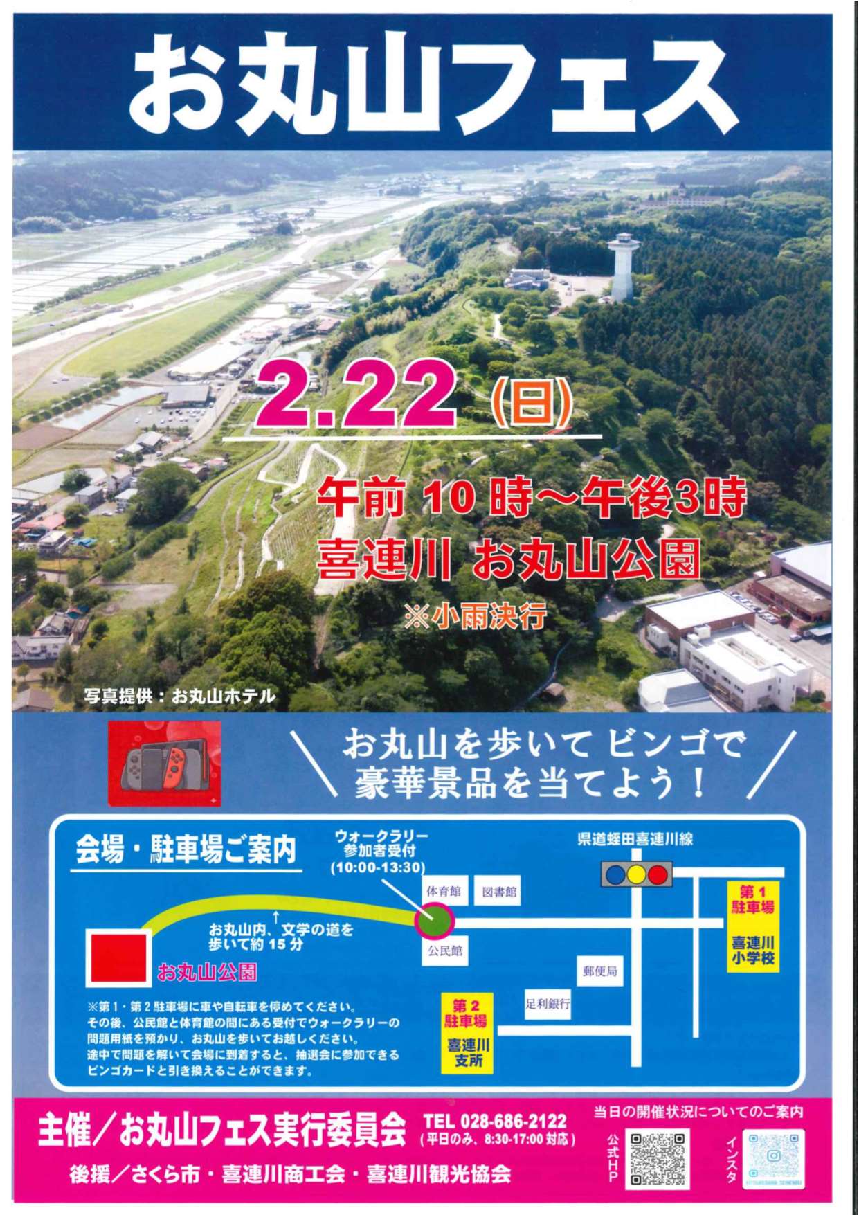 FEB222026 お丸山フェス開催します! 喜連川地区 2月22日(日)お丸山フェス 開催! 2月22日(日)は、お丸山公園に集合!親子で楽しむ「お丸山フェス」開催✨ 喜連川のお丸山公園を中心に、子どもたちが主役になれるワクワクのイベントが盛りだくさんです! 開催期間2026年2月22日(日) 開催時間10:00~15:00まで 開催場所お丸山公園 内容親子で楽しめるウォークラリーやマルシェ・キッチンカー、ステージイベントなど盛りだくさん! 駐車場第1駐車場 喜連川小学校 第2駐車場 さくら市役所喜連川支所 問合せ028-686-2122(お丸山フェス実行委員会) アクセス 電車・バスでのアクセス JR氏家駅よりバスで15分「本町」下車 車でのアクセス 矢板ICより喜連川方面へ約15分、上河内スマートICより R293を氏家喜連川方面へ約30分