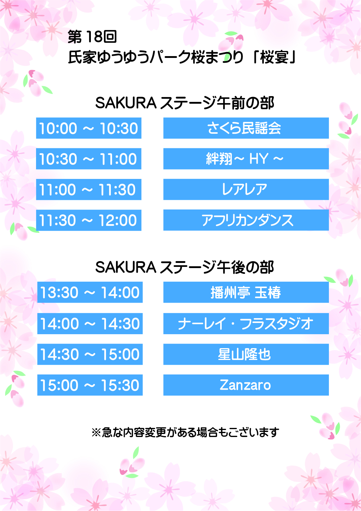 APR042026 4/4(日)限定 桜宴 SAKURA UTAGE SAKURAステージ 桜キッチン 10:00~17:00 キッチンカーやテントショップの出店があります。出店予定(店名と販売予定品)は以下の通りです。店名をクリックすると出店者のSNS等が閲覧できます。 ※販売状況により、早じまいする場合があります。 とんぼ(テントショップ) ・焼きそば ・オムそば ・いか焼き ・からあげ ほか O.N.Y(キッチンカー) ・トルティーヤサンド ・タージーパイ ・かき氷、チーズボールほか 光の鳥(テントショップ) ・焼鳥 ・たこ焼き ・ステーキ串 ・ハラミ串 ・牛タン串 ほうしゃくじポッポコーンけんきゅうしょ ・ポップコーンほか hinano ・グラスサンドアート ・LEDカクテルライトボトル ・アクセサリー、サンドアート販売ほか 雑貨-HAL ・おもちゃ、くじ販売 ・人形すくい ・宝石すくい 市民活動団体さくら会 ・コロッケ ・唐揚げ ・やきそば ・おにぎり ・おでん フィリップモリスジャパン株式会社 ・喫煙所ほか 混雑時の迂回路について ソメイヨシノの咲き具合やイベントの状況によっては帰路が大変混雑する場合がございますので、次の図のようにお帰りくださいますようお願い申し上げます。 問合せ さくら市氏家観光協会 028-681-5757(月休) 9:00~17:00