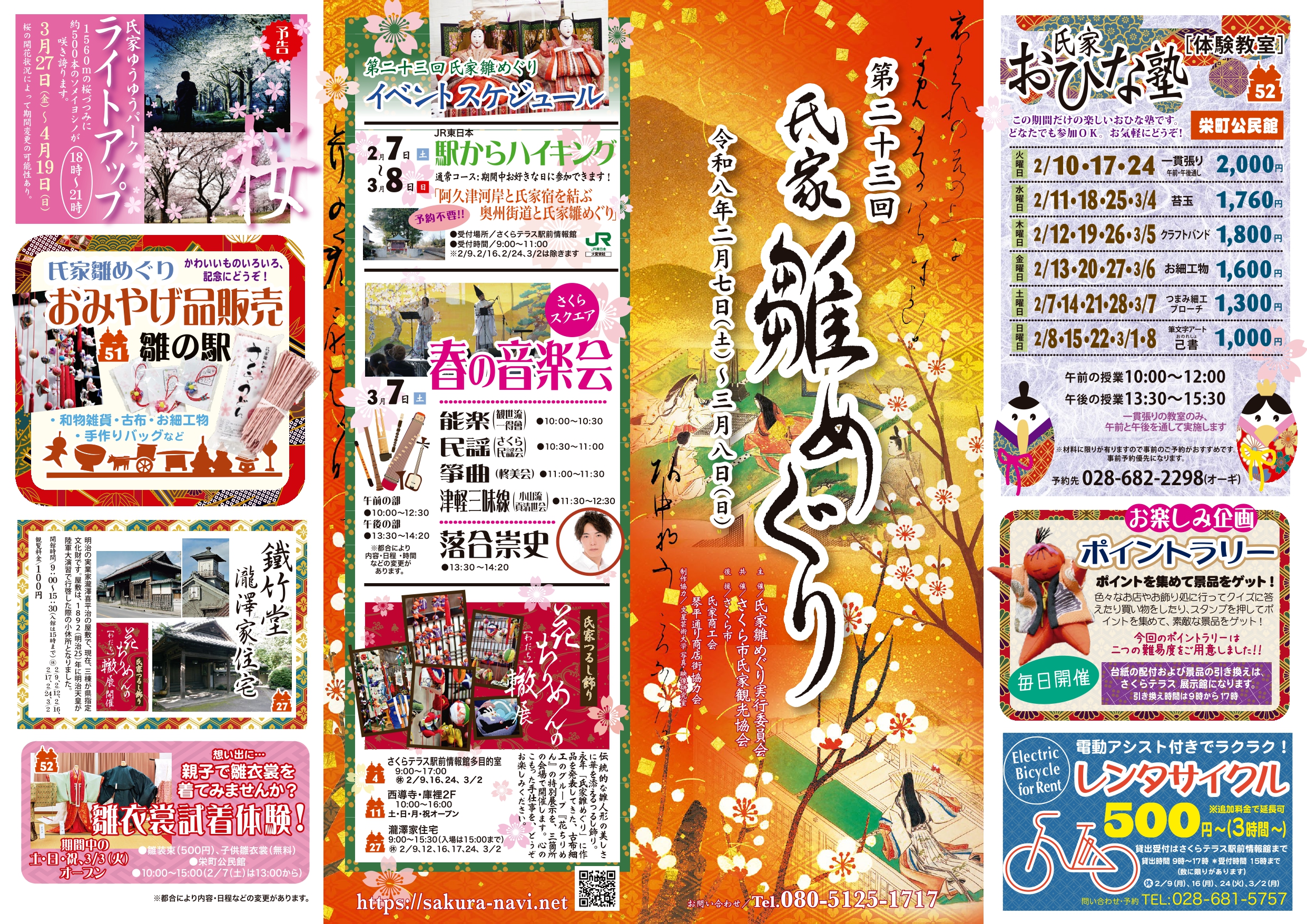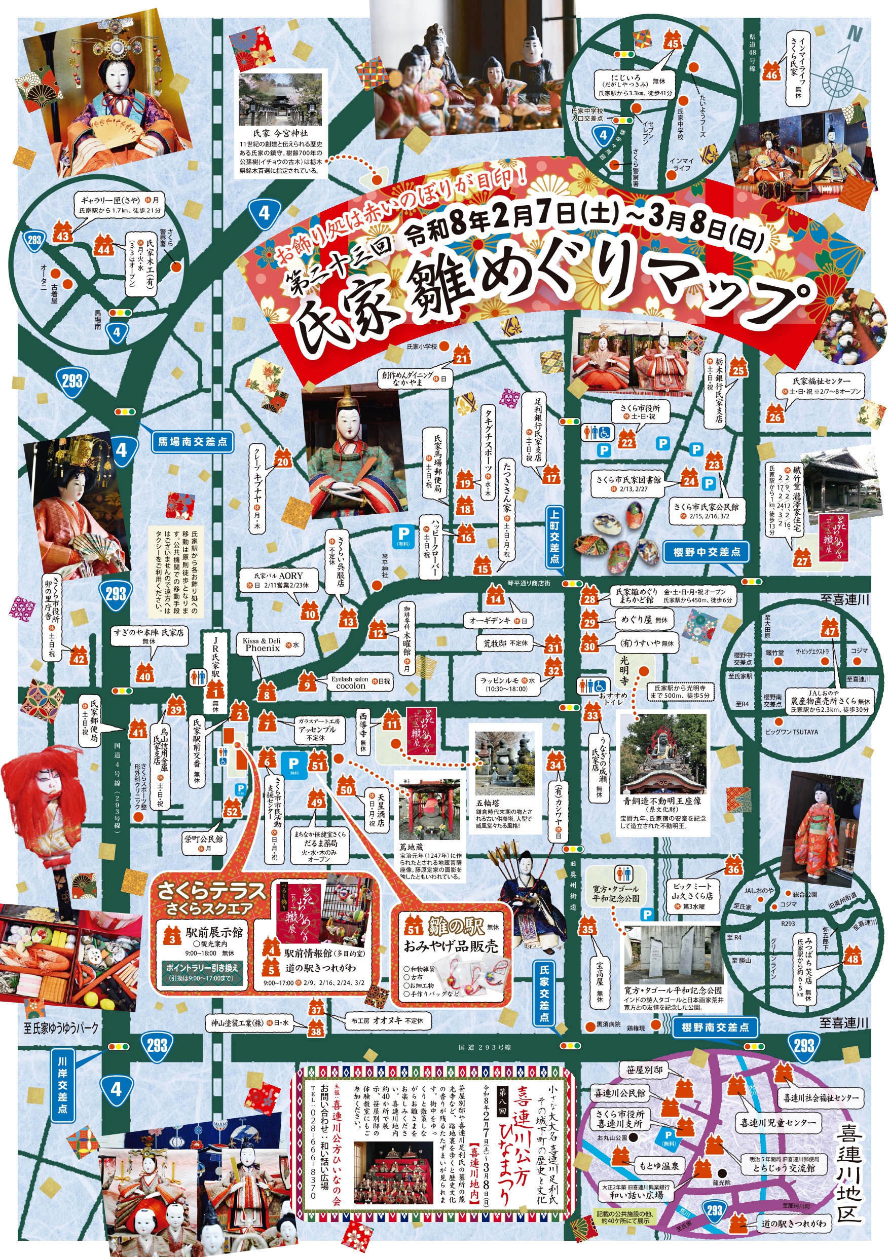 JR氏家駅前及びさくら市役所周辺の商店、公共施設や個人宅など、赤いのぼりが目印のお飾り処約50箇所にて、様々な雛飾りがお客様をお出迎えします。また地元のお細工物教室の方々が1年がかりで作り上げた手作りの繊細なつるし飾りも展示され、大変見応えがございます。他にもたくさんある見どころは、総合案内所・さくらテラス駅前展示館にてご紹介しております。